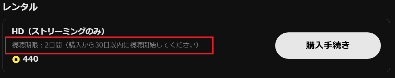購入手続き時に「◯日間(購入から30日以内に視聴開始してください」と記載されている作品は、購入手続きが完了した後、30日以内に「初回の視聴」、または「ダウンロード」を行うと設定されている期間に限り視聴できます。