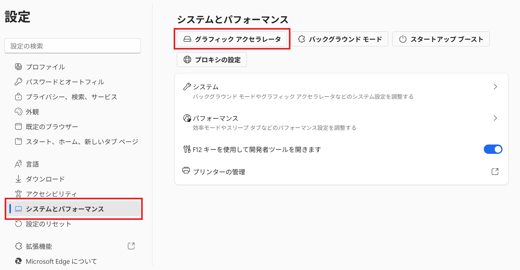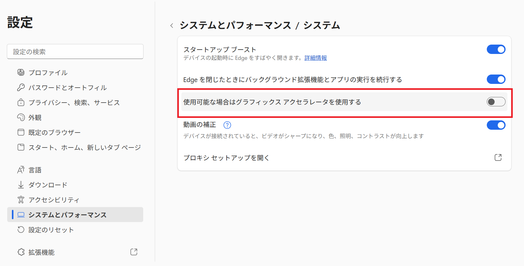 「システムとパフォーマンス」の項目にある「グラフィック アクセラレータ」を開く