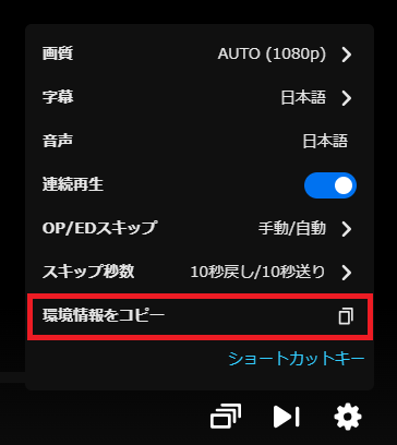 再生ができない状態が継続する場合、プレイヤー下部の設定(歯車)内にある「環境情報をコピー」を押して取得できた情報を添えてお問い合わせください。