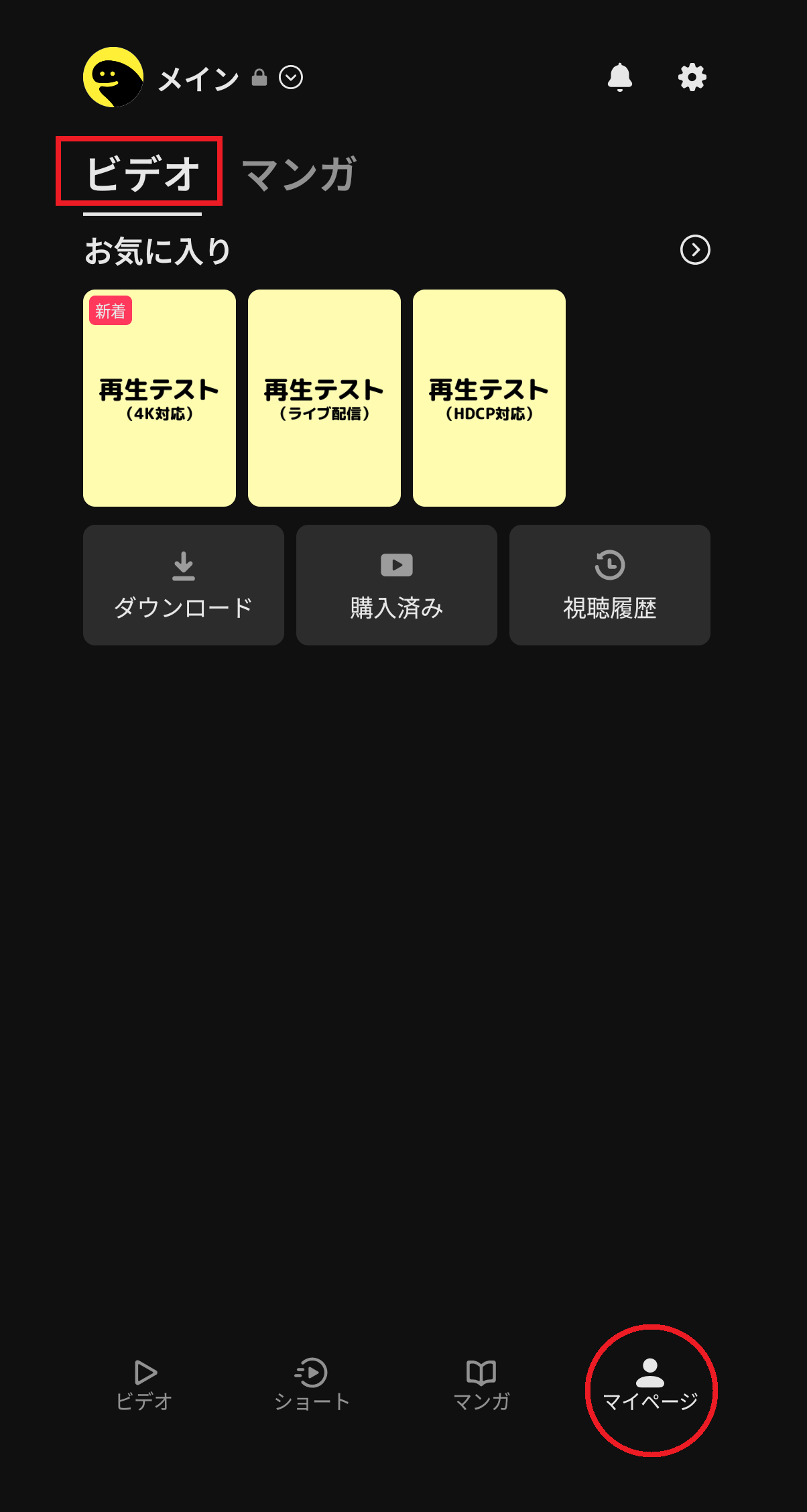 DMM TVアプリにログイン後「マイページ」を開き、(1.)でお気に入りに登録した動画が再生できるかご確認ください。