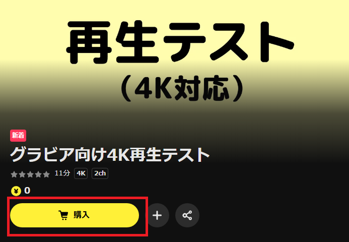 アプリにテスト動画を表示させるため、Webブラウザで「グラビア向け4K再生テスト動画」を開き、この動画を購入します