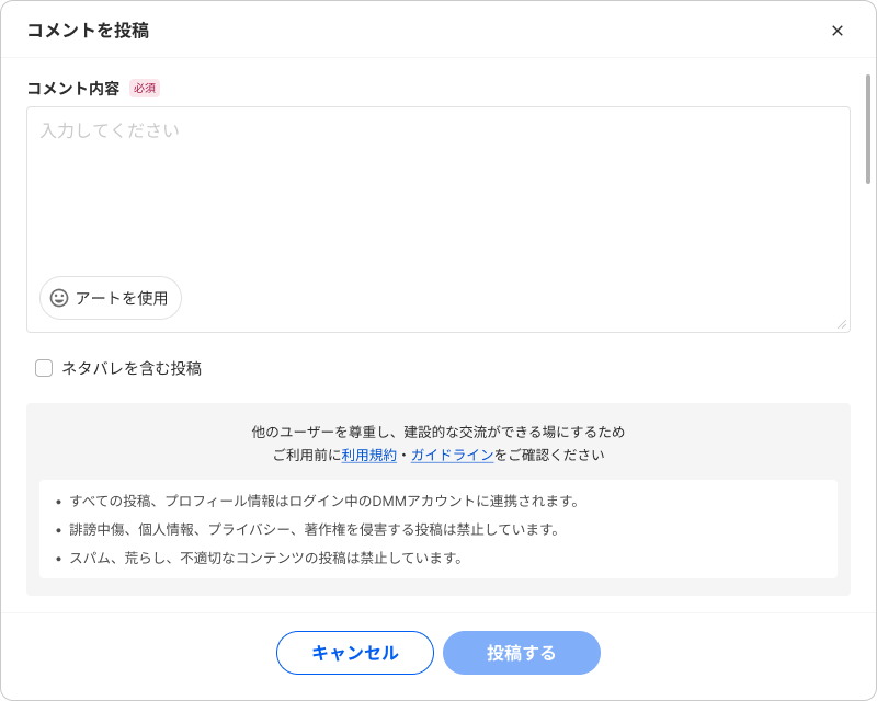 トピック内でのコメント投稿について教えてくださいトピック内にコメントを投稿することができます。本文(必須)1000文字まで入力できます。ネタバレを含むネタバレが含まれるかどうかを設定できます。最近の閲覧数: 3トピックについてヘルプに戻る