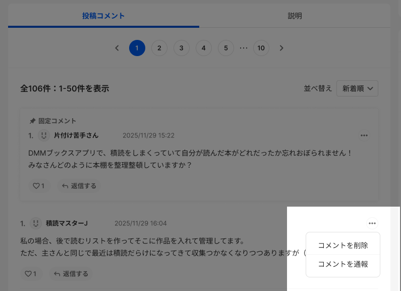 投稿コメントの右上アイコンから「コメントを削除」を選択してください。