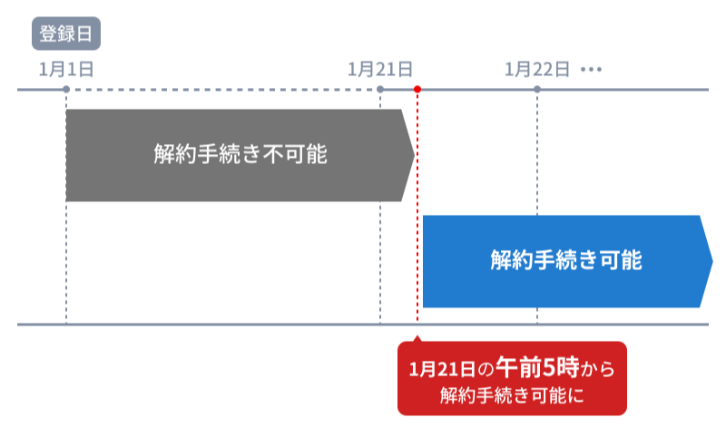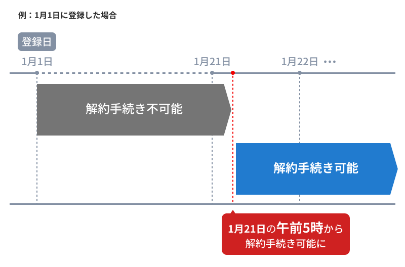 登録日から数えて21日目の午前5時以降であれば、いつでも解約手続きが可能です。