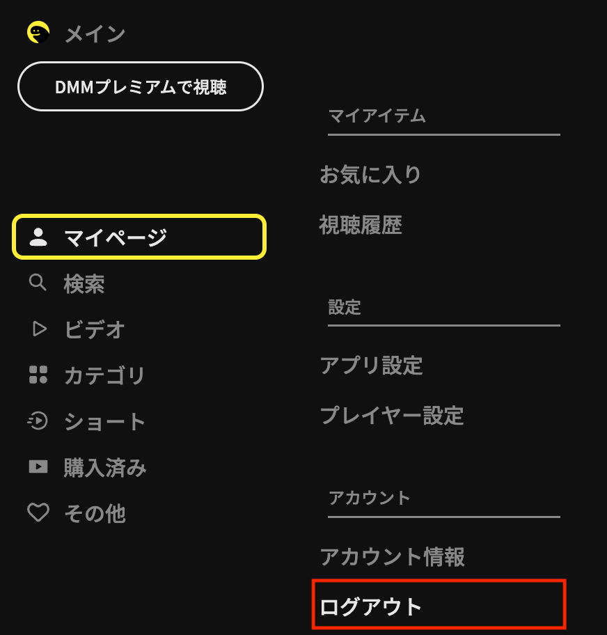 DMM TVサイト右上の人型マークを押下し、メニュー下部の「ログアウト」ボタンからログアウトしてください。