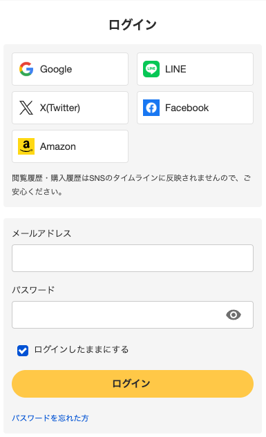 Google・LINE・Xなどの外部アカウントを利用して会員登録した場合は、登録した方法を選択しログインしてください。